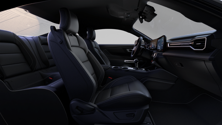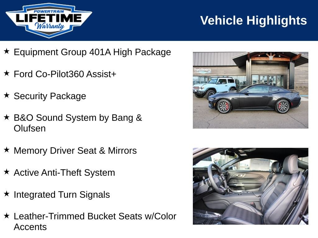Step inside the Mustang GT Premium and be captivated by the premium cabin. Indulge in the comfort of the leather-trimmed bucket seats with color accents, while the memory driver's seat and mirrors ensure your perfect driving position is always ready. The 12-speaker B&O sound system by Bang & Olufsen delivers an immersive audio experience, elevating your daily commute or weekend drives.
