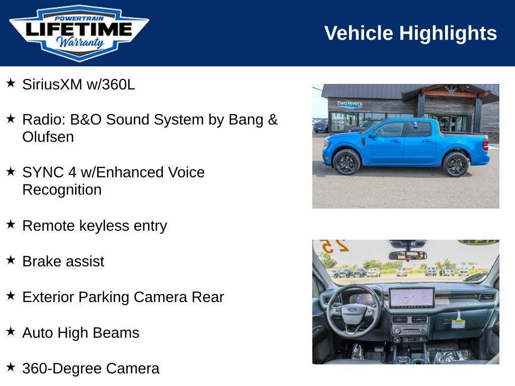 This Maverick Lobo High is more than just a capable truck – it's a premium driving experience. The B&O Sound System by Bang & Olufsen, SiriusXM with 360L, and SYNC 4 with Enhanced Voice Recognition provide an unparalleled multimedia experience. The heated steering wheel, wireless charging pad, and ambient lighting create a luxurious and comfortable cabin, while the 360-degree camera and Pro Trailer Backup Assist make maneuvering a breeze.