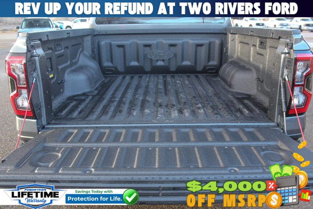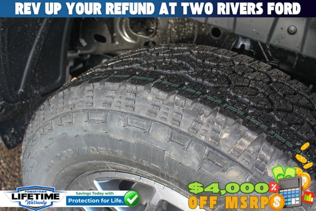 4WD, 12 Display in Center Stack, 120V/400W In-Cab & In-Bed Power Outlets, 4-Wheel Disc Brakes, 6 Speakers, ABS brakes, Advanced Towing Package, Air Conditioning, Alloy wheels, AM/FM radio: SiriusXM, AM/FM Stereo, Auto High-beam Headlights, Auto-dimming Rear-View mirror, Brake assist, Class IV Trailer Hitch Receiver, Cloth Front Bucket Seats, Compass, Convenience Package, Delay-off headlights, Driver door bin, Driver vanity mirror, Dual front impact airbags, Dual front side impact airbags, Dual-Zone Electronic Climate Control (DEATC), Electronic Stability Control, Emergency communication system: SYNC 4 911 Assist, Engine Block Heater, Equipment Group 301A High, Front anti-roll bar, Front Bucket Seats, Front Center Armrest, Front fog lights, Front License Plate Bracket, Front reading lights, Front wheel independent suspension, Fully automatic headlights, Gray Painted Center Bar & Grille Surround, Gray Painted Front Fascia & Rear Bumper, Illuminated entry, Internet access capable: FordPass Connect 4G, Leather Shift Knob, Low tire pressure warning, Navigation system: Connected Navigation, Occupant sensing airbag, Outside temperature display, Overhead airbag, Overhead console, Panic alarm, Passenger door bin, Passenger vanity mirror, Power door mirrors, Power steering, Power windows, Power-Sliding Rear Window, Pro Trailer Backup Assist, Rear reading lights, Rear seat center armrest, Rear step bumper, Rear window defroster, Remote keyless entry, Security system, SiriusXM Satellite Radio, Speed control, Speed-sensing steering, Sport Appearance Package, Sport Box Decal, Steering wheel mounted audio controls, SYNC 4A w/Connected Navigation, Telescoping steering wheel, Tilt steering wheel, Tough Bed Spray-In Bedliner, Traction control, Trailer Brake Controller, Trailer Tow Package, Tray Style Floor Liner, Trip computer, Variably intermittent wipers, Voltmeter, Wheels: 17 Gray-Painted Aluminum, Wireless Charging Pad, 4WD.