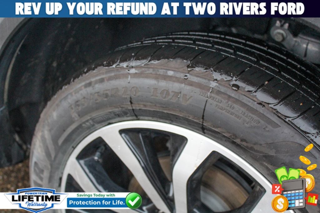 The exterior of this vehicle exudes a commanding presence, with its sleek Gray finish and bold, athletic styling. The 20-inch Ebony-Painted Machined Aluminum wheels further accentuate the ST-Line's dynamic appearance, while features like the power liftgate, heated and power-adjustable side mirrors, and rear spoiler add both convenience and style.
