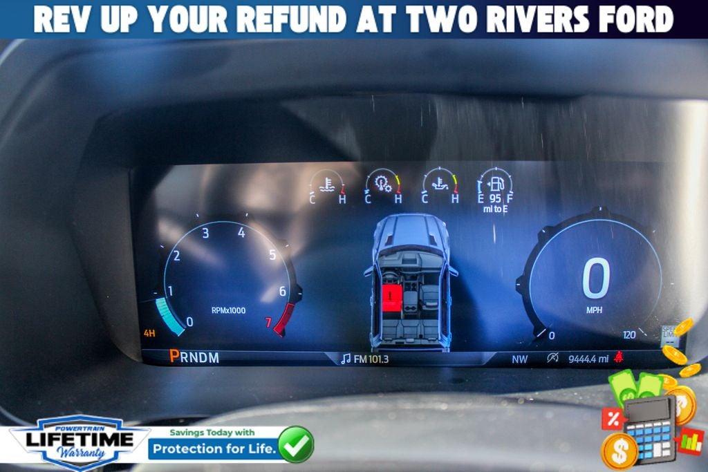 4WD, 3.31 Axle Ratio, 4-Wheel Disc Brakes, 8 Speakers, ABS brakes, ActiveX Trimmed Bucket Seats, Adjustable pedals, Air Conditioning, Alloy wheels, AM/FM radio: SiriusXM with 360L, Auto High-beam Headlights, Auto-dimming door mirrors, Auto-dimming Rear-View mirror, Automatic temperature control, Brake assist, Bumpers: chrome, Chrome wheels, Compass, Delay-off headlights, Driver door bin, Driver vanity mirror, Dual front impact airbags, Dual front side impact airbags, Electronic Stability Control, Emergency communication system: SYNC 4 911 Assist, Front anti-roll bar, Front Bucket Seats, Front Center Armrest, Front dual zone A/C, Front fog lights, Front reading lights, Front wheel independent suspension, Fully automatic headlights, Garage door transmitter, Heated door mirrors, Heated front seats, Heated steering wheel, Illuminated entry, Internet access capable: FordPass Connect 5G, Low tire pressure warning, Memory seat, Navigation system: Connected Navigation, Occupant sensing airbag, Outside temperature display, Overhead airbag, Overhead console, Panic alarm, Passenger door bin, Passenger vanity mirror, Pedal memory, Power door mirrors, Power driver seat, Power passenger seat, Power steering, Power windows, Radio data system, Radio: B&O Sound System by Bang & Olufsen, Rain sensing wipers, Rear reading lights, Rear seat center armrest, Rear step bumper, Rear window defroster, Remote keyless entry, Security system, Speed control, Split folding rear seat, Steering wheel mounted audio controls, SYNC 4 w/Enhanced Voice Recognition, Tachometer, Telescoping steering wheel, Tilt steering wheel, Traction control, Trip computer, Turn signal indicator mirrors, Variably intermittent wipers, Ventilated front seats, Voltmeter, Wheels: 18 Chrome-Like PVD, 4WD.